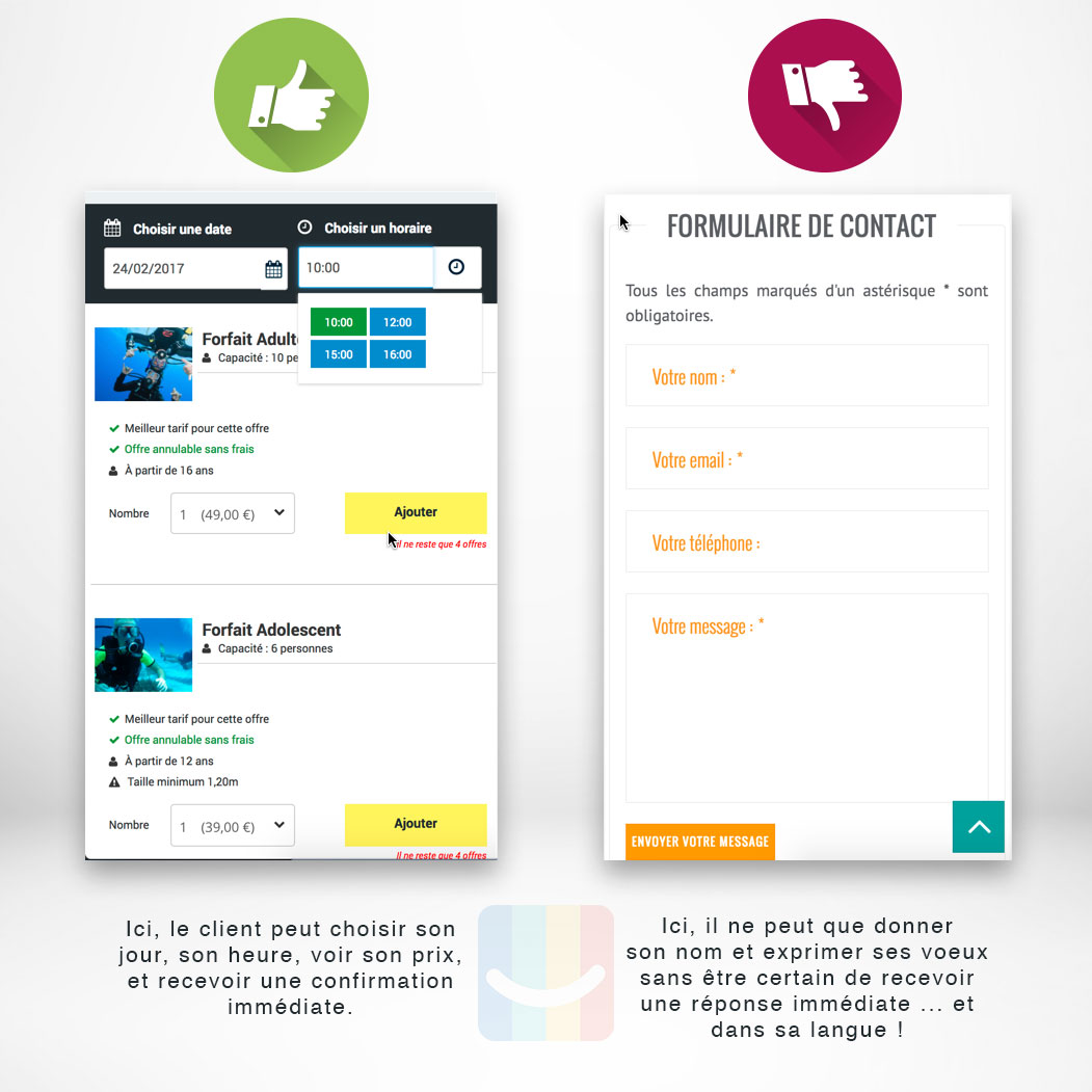 Cela veut dire que l'on doit passer du simple formulaire de contact (avec une réponse dans les 48 heures ou plus ...) à un vrai système de réservation où le client choisit son jour, son heure et compose lui-même son panier de réservation, dans sa langue, comme pour la réservation d'hôtel.