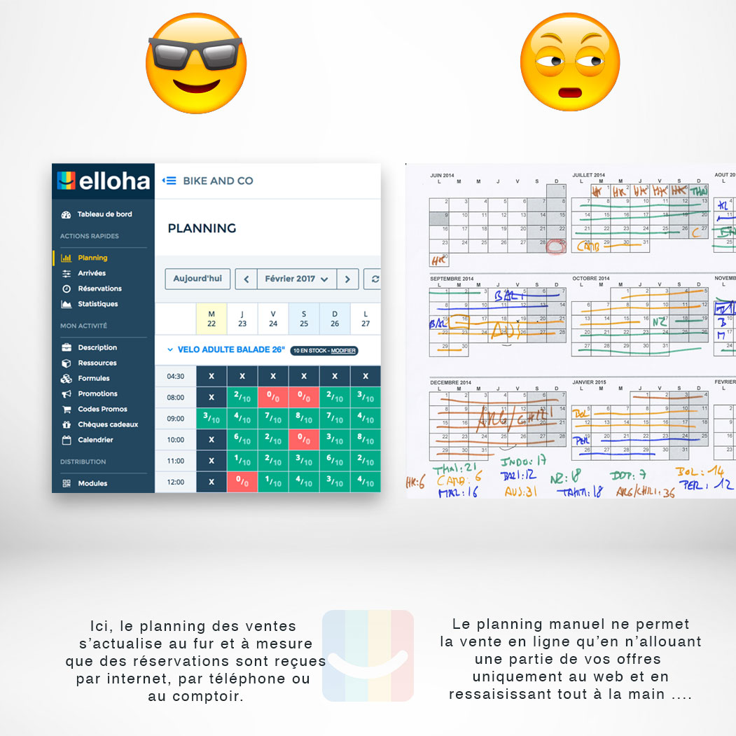 Dès lors, il faut veiller à ce que ce qui est acheté sur internet (sur votre site ou sur des sites partenaires) soit bien répercuté sur votre planning, que les disponibilités de vos équipements éventuels soient immédiatement mises à jour ... en clair, que vous évitiez le surbooking ou la rupture de stock.