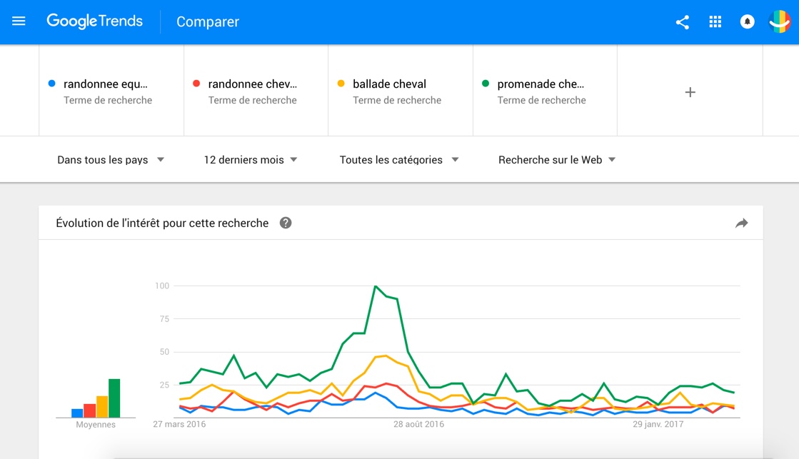 Le terme "promenade cheval" s'impose en juillet et août avec les expressions voisines (à utiliser impérativement dans vos mots clés si vous êtes du secteur) :