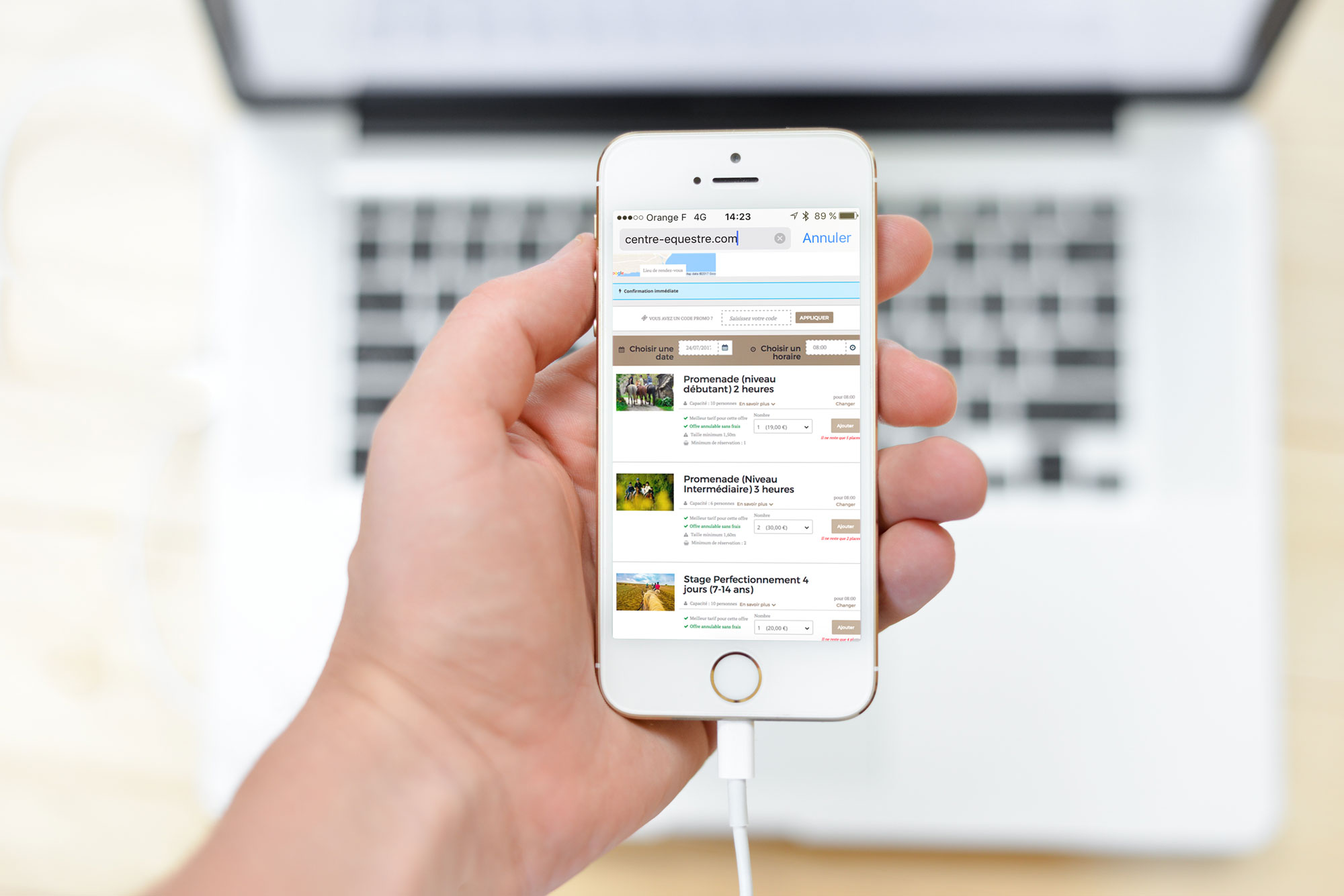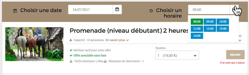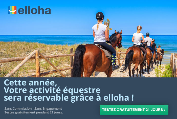 Ici, le moteur de réservation pour centres équestres de elloha qui permet de réserver à l'heure ou sur plusieurs jours, avec confirmation immédiate ou différée (en fonction des aléas climatiques ou des taux de remplissage)