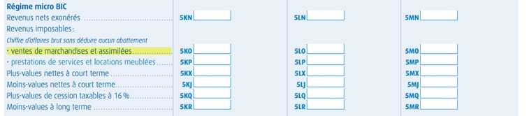 Dans ce cas, la totalité de vos recettes 2016 doit être déclarée dans les cases 5KO, 5LO ou 5MO de la ligne Ventes de marchandises et assimilées.