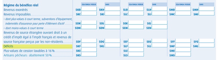 - Votre résultat fiscal est déficitaire : mentionnez-le dans la ligne Déficits dans les cases 5NY, 5OY ou 5PY sous la rubrique CGA (si vous bénéficiez d'un visa fiscal) ou dans les cases 5NZ, 5OZ ou 5PZ, si vous ne bénéficiez pas d'un visa fiscal.