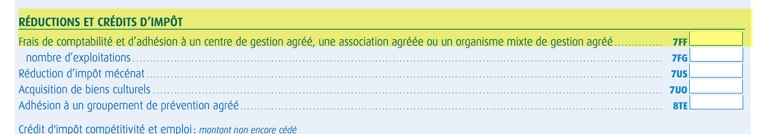 Pour cela, n'oubliez pas de remplir la case Frais de comptabilité et d'adhésion à un centre de gestion ou une association agréée sous la ligne Réductions d'impôts - case 7FF de la page 4 du Cerfa 2042, Professions Non Salariées.