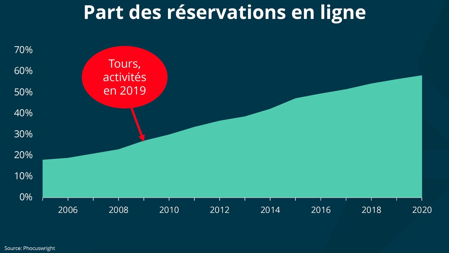 En 2019, la réservation d'activités passera encore plus via le web et le mobile et ce, même si ce secteur est encore très en retard (par rapport aux hôtels, campings et maisons d'hôtes) sur leur réservation en ligne. Comme le démontre l'étude de Arival, la vente en ligne de loisirs figure aujourd'hui au même niveau que ne l'étaient les hébergeurs il y a de cela 9 neuf ans !