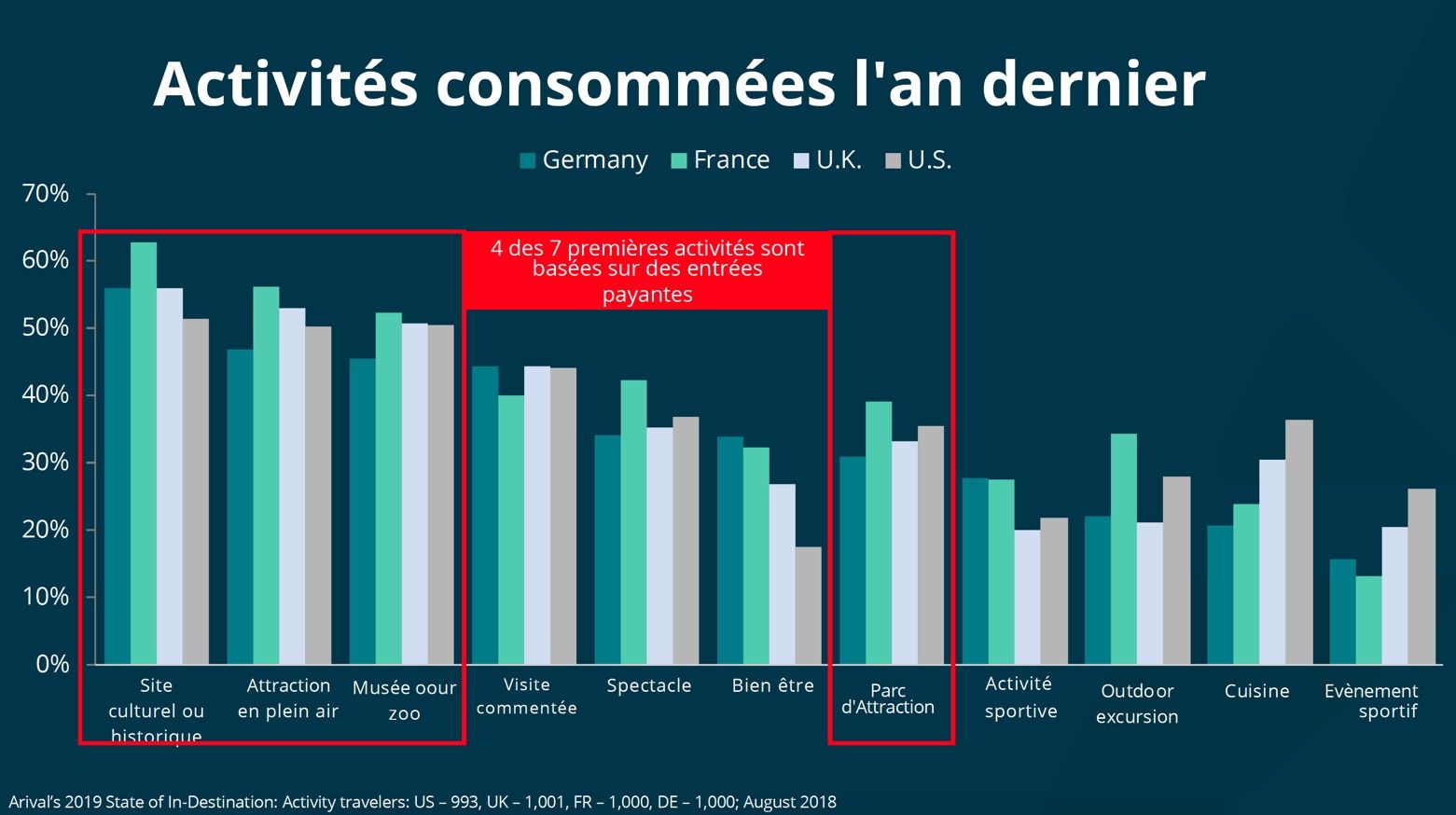Ce constat est dressé dans La dernière étude publiée par Arival, les spécialistes mondiaux de l'analyse du marché des activités et des attractions, menée auprès de 4000 voyageurs en France, au Royaume-Uni, aux Etats-Unis et en Allemagne. L'activité reste donc le "coeur" du séjour de l'immense majorité des voyageurs puisque l'étude révèle aussi que les voyageurs en consomment en moyenne 7 activités durant leurs vacances dont, 4 au moins, sont des activités payantes ... soit 25% de leur budget vacances total !