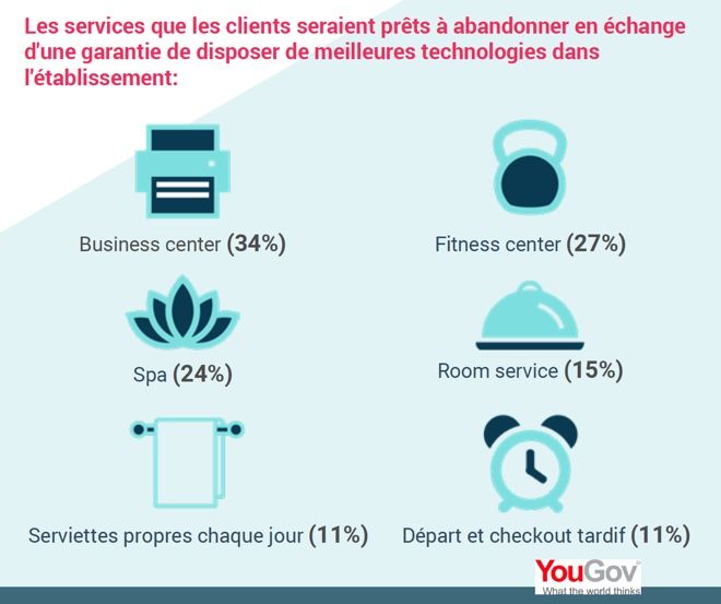 Et de ses équipements... Car les clients sont aussi de plus en plus connectés et sont très vigilants aux équipements proposés par telle ou telle adresse. Mieux ! Selon l'étude de YouGov, pour s'assurer d'avoir de meilleurs équipements technologiques (bonne connexion WiFi, enceintes connectées à leur propre mobile, possibilité de lire leurs vidéos depuis leur tablette vers vos écrans, etc ...), la majorité des clients serait prête à sacrifier des équipements et services plus "traditionnels" (voir ci-dessous).