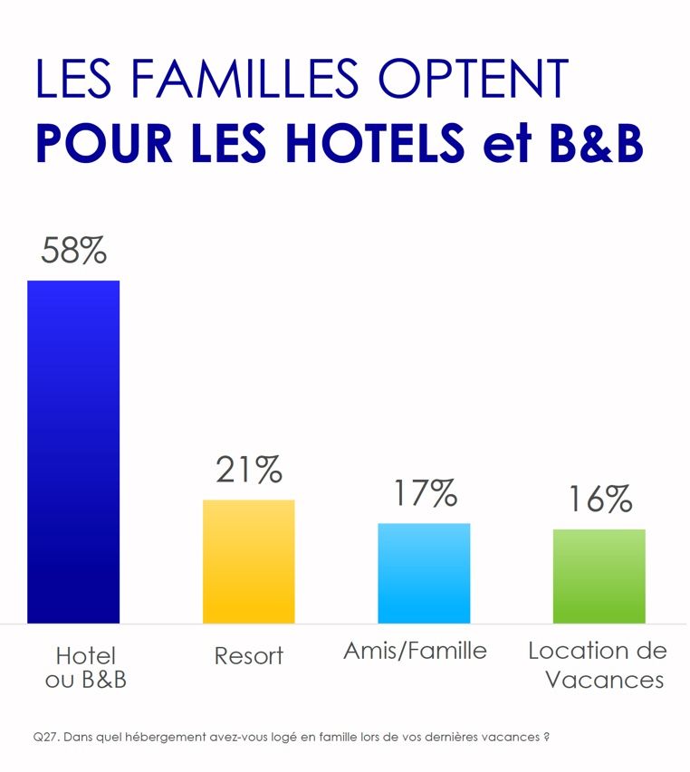 Cette clientèle - contrairement à ce que l'on pourrait penser - privilégie l'hôtel et les maisons d'hôtes à plus de 58% : éviter de cuisiner, de faire les lits, disposer de services et d'animations sur place ... bref, tout ce que les familles ont beaucoup de mal à trouver dans une "simple" location de vacances.
