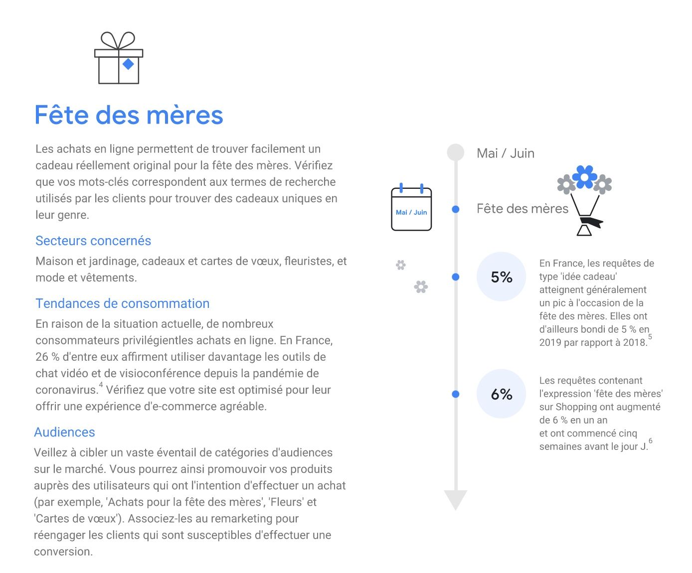 L'étude Google démontre aussi que - comme pour les voyages et les loisirs - si les achats se font de plus en plus en dernière minute, les recherches de cadeaux et d'achats commencent relativement tôt, soit, en moyenne, 5 semaines avant les "grands carrefours" comme la fête des mères, la fête des pères, etc ...