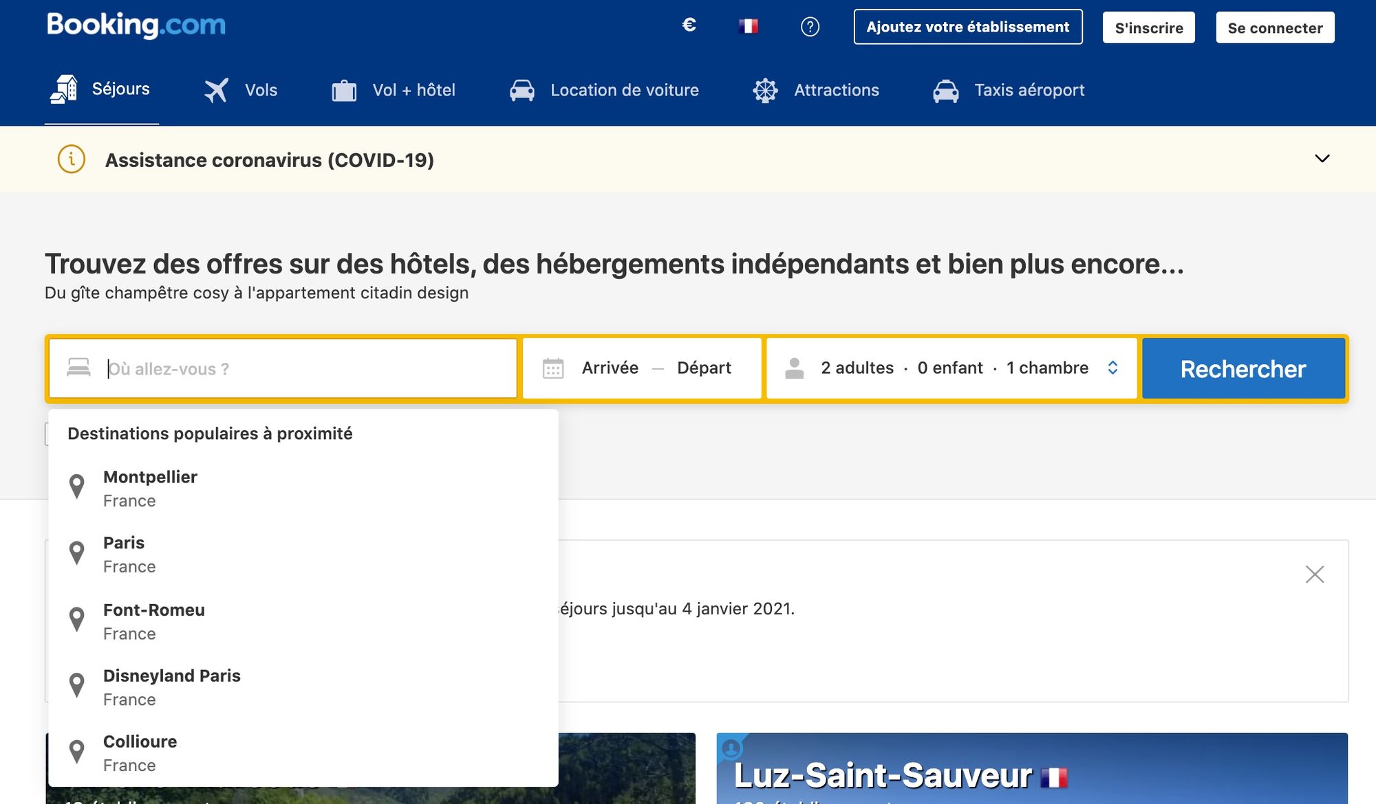 Chez Booking, où des millions de réservations sont analysées chaque semaine, on savait que l’évitement des lieux de grands rassemblements, minoritaire cet été, serait une exigence à l’automne. Nous y voilà. De nombreux voyageurs souhaitent fuir la foule et les clusters potentiels, sans rechigner au plaisir de partir. La carte de France des métropoles avec ou sans couvre-feu est provisoire, car l’Hexagone entier connaîtra le coronavirus et son cortège de contraintes. Alors, anticipez la généralisation des mesures de protection, sans oublier la réalité : le besoin de vacances est intact. Booking a donc créé une fonction de recherche à proximité, qui doit aider l'internaute à "trouver l'évasion à deux pas de chez lui" et, pour votre établissement, à augmenter votre visibilité pendant la longue remontée vers une ère post-Covid dont personne ne sait quand elle aura lieu. Le Président Macron estime que le Covid est avec nous au moins jusqu’à l’été 2021 ? Prenons cela comme une fatalité positive et adaptons-nous en conséquence.