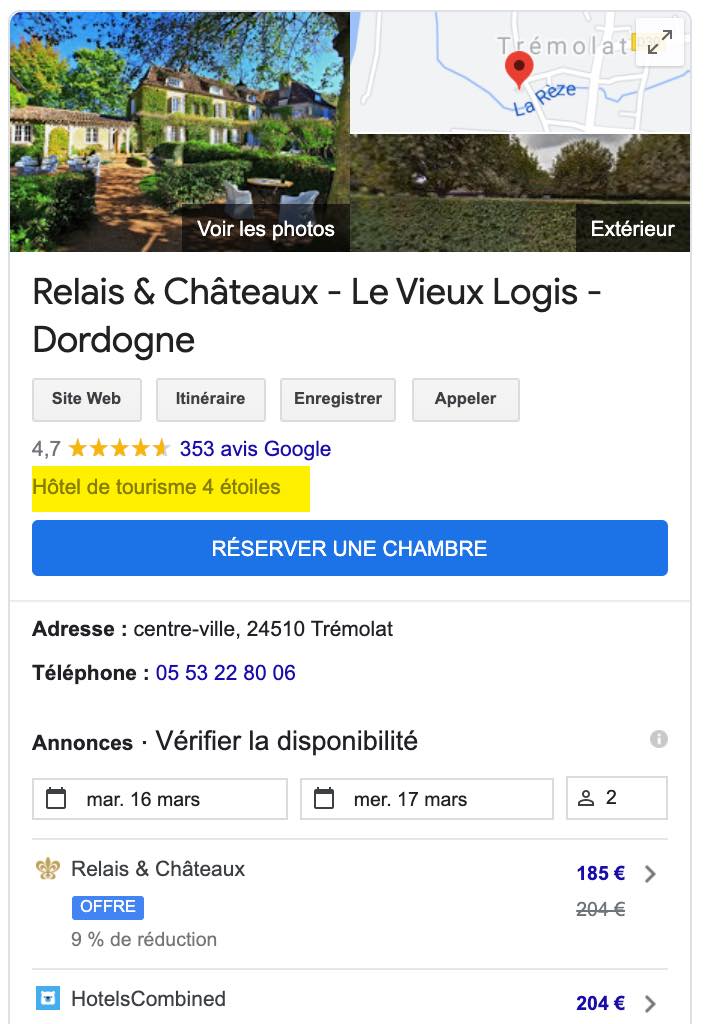 Car, jusqu'en 2019, les étoiles affichées sur Google n'avaient aucun lien avec les étoiles "officielles" décernées en France selon un système très ancien, reposant sur un cumul de quelques 250 points de contrôles. Ces étoiles "maison" reposaient sur des algorithmes propres à Google où entraient en ligne de compte les avis constatés sur Google (voir plus loin), la présence ou non d'informations "froides" comme les photos, la description de l'hôtel, le prix moyen de ses nuitées, etc ... Bref, rien à voir avec les classements "officiels" de 1 à 5 étoiles, bien connues des touristes.