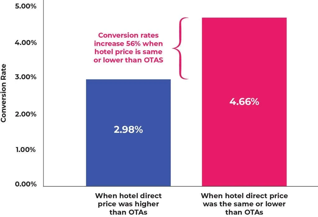 L'étude de Cendyn démontre que le client préfèrera toujours réserver chez vous si vous affichez un prix au moins équivalent sinon inférieur à celui de l'OTA: votre taux de conversion (combien de visiteurs de votre site sont devenus des acheteurs effectifs) peut ainsi passer de 2,98% à 4,66% (soit 56% de plus !).