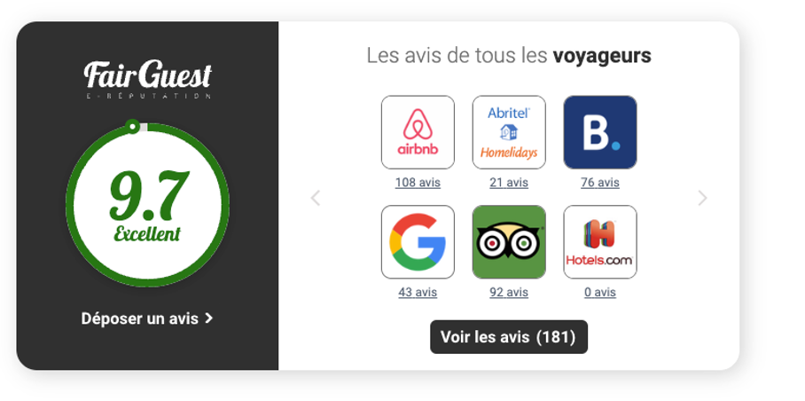 En faisant cette sélection, les futurs clients voient les messages les plus importants pour valoriser l'image de l'établissement. Mais, FairGuest ne se limite pas aux avis collectés (et sélectionnés) par l'établissement lui-même via un widget spécial... Pour apporter de la "preuve sociale" à la "preuve sociale", la solution permet des les afficher avec les commentaires et les notes recueillis sur les principaux sites d’avis comme Google, TripAdisor, Booking, Airbnb, Hotels.com … La plateforme FairGUEST se charge de récupèrer automatiquement tous les avis sur ces plateformes - chaque jour - et calcule la note moyenne de l'établissement tous sites d’avis confondus.
