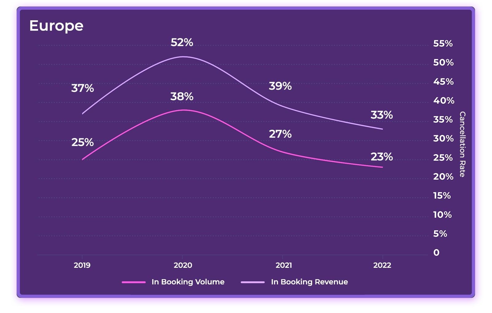 Bonne nouvelle ! Si l'on en croit l'étude de D-Edge (voir ci-dessus), les annulations seraient en léger recul par rapport à 2019: 33% des volumes (soit 1 réservation sur 3) serait annulée en Europe contre 37% en 2019; ce qui représente encore, à ce jour, 23% de la valeur des revenus potentiels d'un hôtel ...