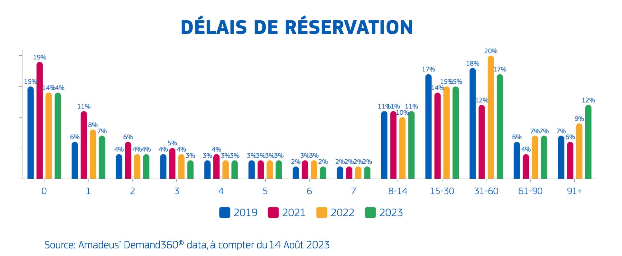Cette tendance se confirme aussi en regardant de plus près les "fenêtres de réservation" observées par Amadeus depuis le 14 août dernier (la fenêtre de réservation est l'écart qui sépare la date de réservation du jour d'arrivée sur place). Selon cette donnée (voir ci-dessous), on constate que les séjours se réservent un peu plus tard que les années précédentes (avec une forte pression sur le délai allat de 8 à 30 jours); ce qui pourrait expliquer que de nombreux voyageurs aient réservé pour septembre durant la récente période estivale (du jamais vu dans ces proportions ...).