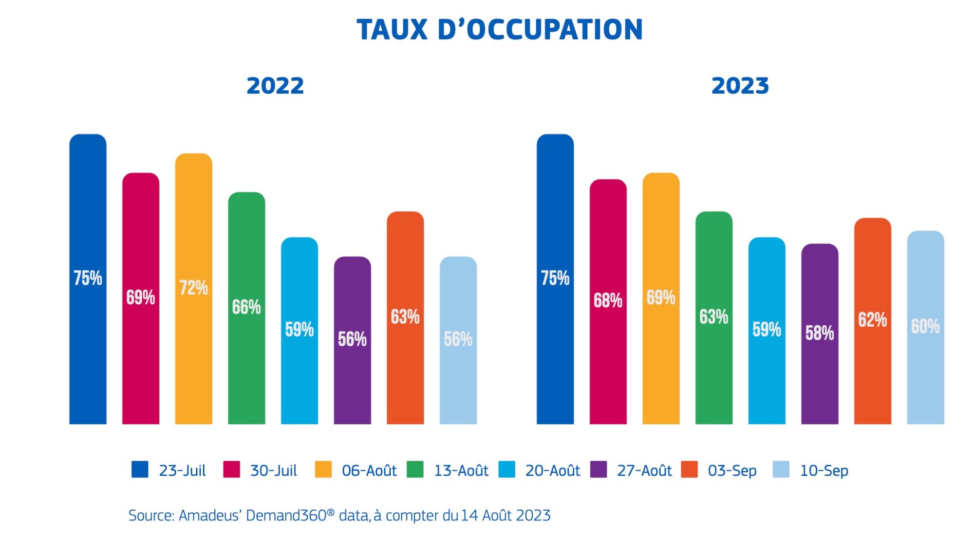 Certes, l'été 2023 n'aura pas été un long fleuve traquille et les résultats apparaissent comme très disparates d'une région à l'autre, avec des taux d'occupation et des RevPar (Revenus par Chambre). Comme le révèele le dernier rapport Amadeus pour la France (sur les réservations effectives de cet été), globalement l'été 2022 auara connu la même dynamique (à 2 ou 3 semaines près) que celui de l'année précédente.