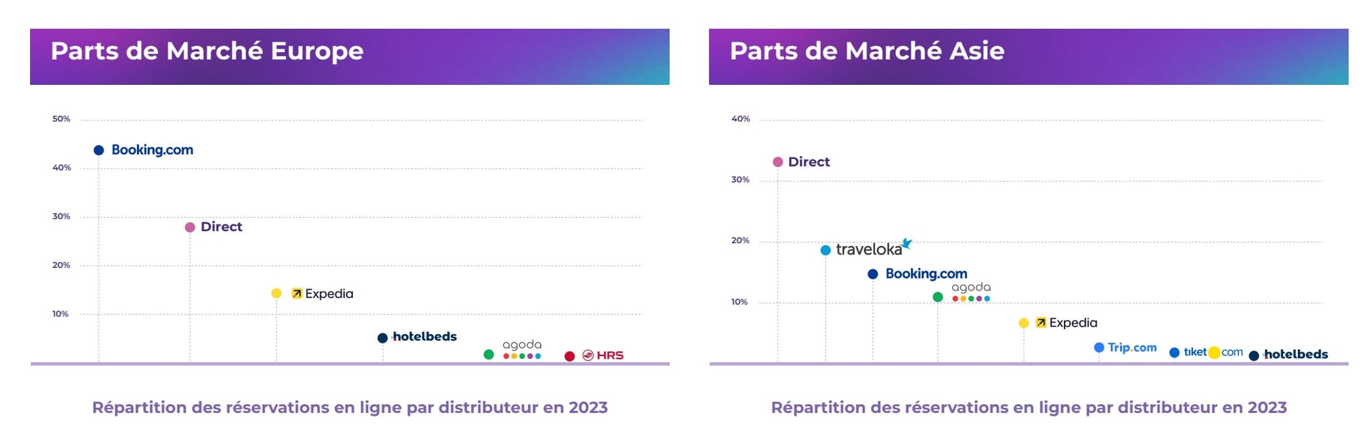 Ce qui reste, cependant, notoire en Asie est que les réservations directes restent la première source de revenus des hôteliers bien avant les OTAs comme Traevloka (OTA très présent en Asie et très peu en Europe) ou encore Booking. Alors qu'en Europe (voir ci-dessous), le rapport 2024 démontre que Booking domine, et de loin, la part des réservations cumulées par les hôteliers; la part "directe" n'arrivant qu'en 2ème position.
