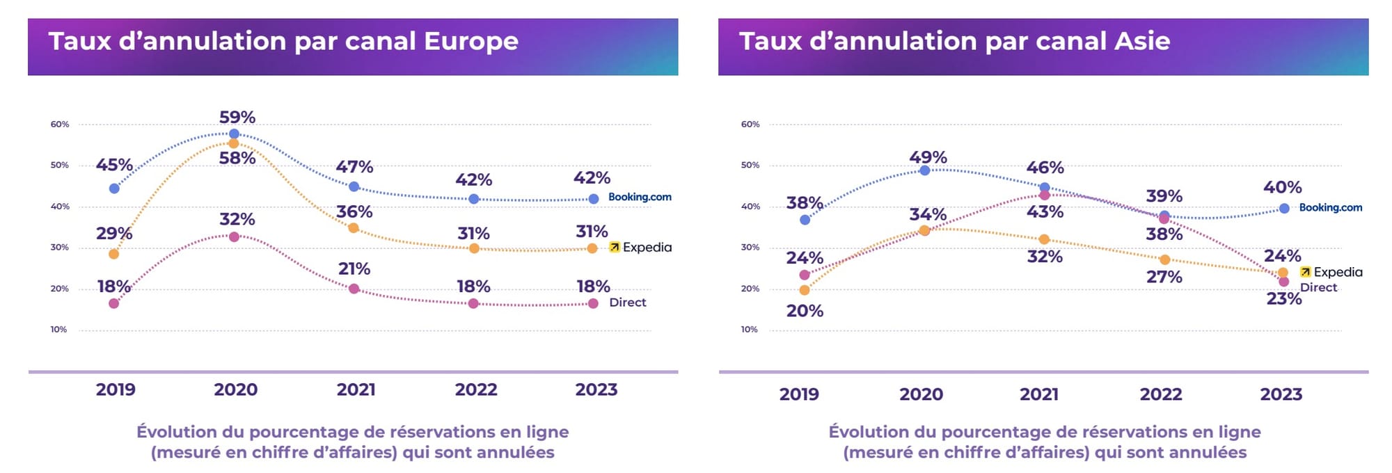 Enfin, selon ce rapport, orienter vos actions vers "plus de réservations directes", c'est aussi mieux vous prémunir contre des annulations à foison. D'après les observations réalisées par la filiale du groupe Accor, les réservations reçues de Booking sont, en général, annulées dans 42% des cas (en 2023) contre 18%, seulement, des réservations reçues en "direct" !