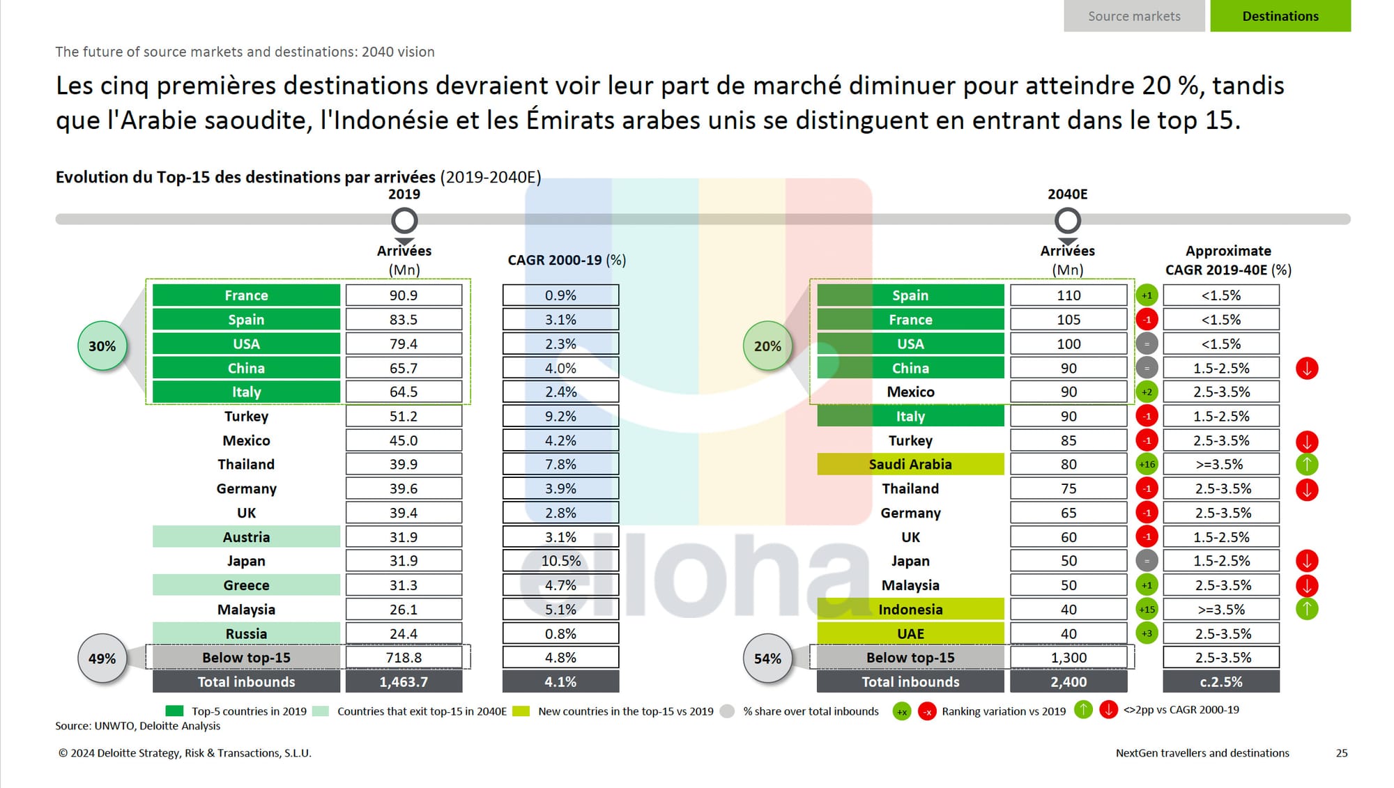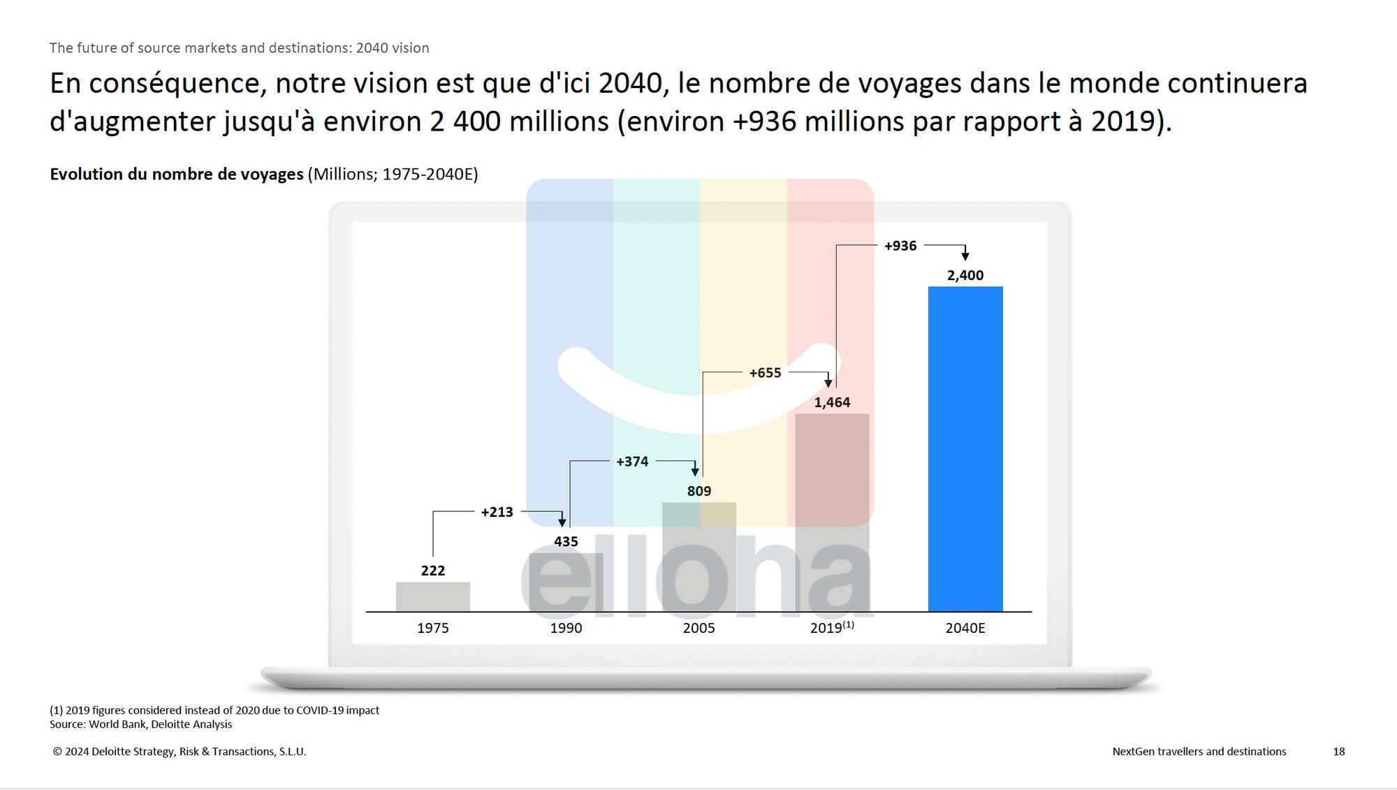 Selon cette étude prédictive, 936 millions de nouveaux voyageurs (par rapport à 2019) devraient alimenter un taux de croissance annuel moyen d'environ 2,5% entre 2019 et 2040. Les principaux marchés émetteurs seraient l'Afrique et les Amériques qui devraient connaître la plus forte croissance. Cependant, l'Europe et l'Asie-Pacifique représenteront toujours environ 75% du marché en 2040 et les 5 premiers pays émetteurs (Chine, États-Unis, Inde, Allemagne, Royaume-Uni) devraient représenter 42% du marché en 2040.