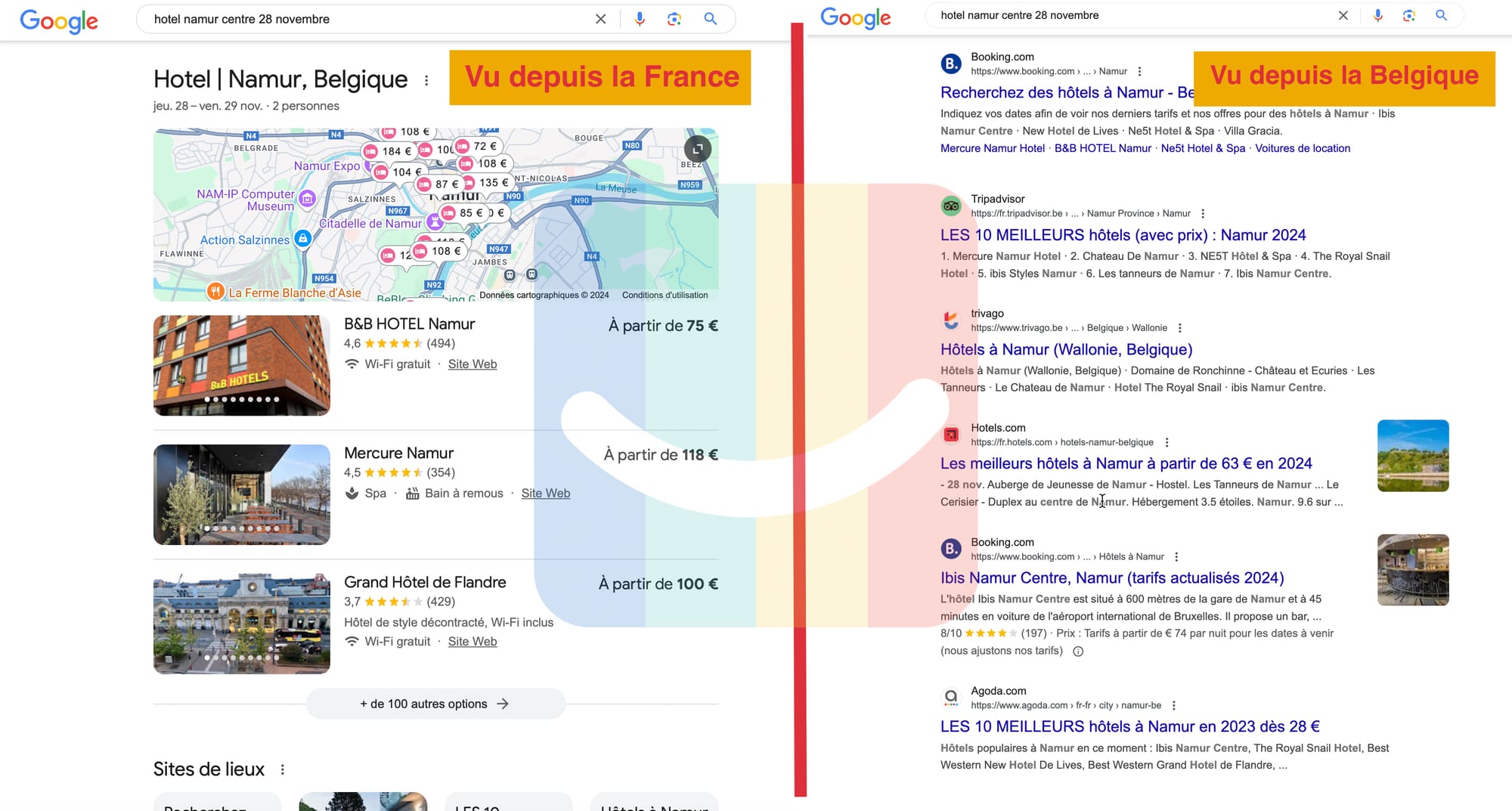 Comme vous pouvez le constater, ce changement (sous forme de test) n'est pas des plus anondins dans la manière de voir les résultats et il n'est donc pas sans conséquences sur 1) l'expérience de l'utilisateur qui est très largement appauvrie (sur la version belge versus la version française) et 2) sur les perspectives, pour un professionnel du tourisme, de continuer à être mis en valeur à juste titre. On voit bien, sur la liste publiée en Belgique, le retour en force de la suprématie des OTAs via le retour des "liens bleus".
