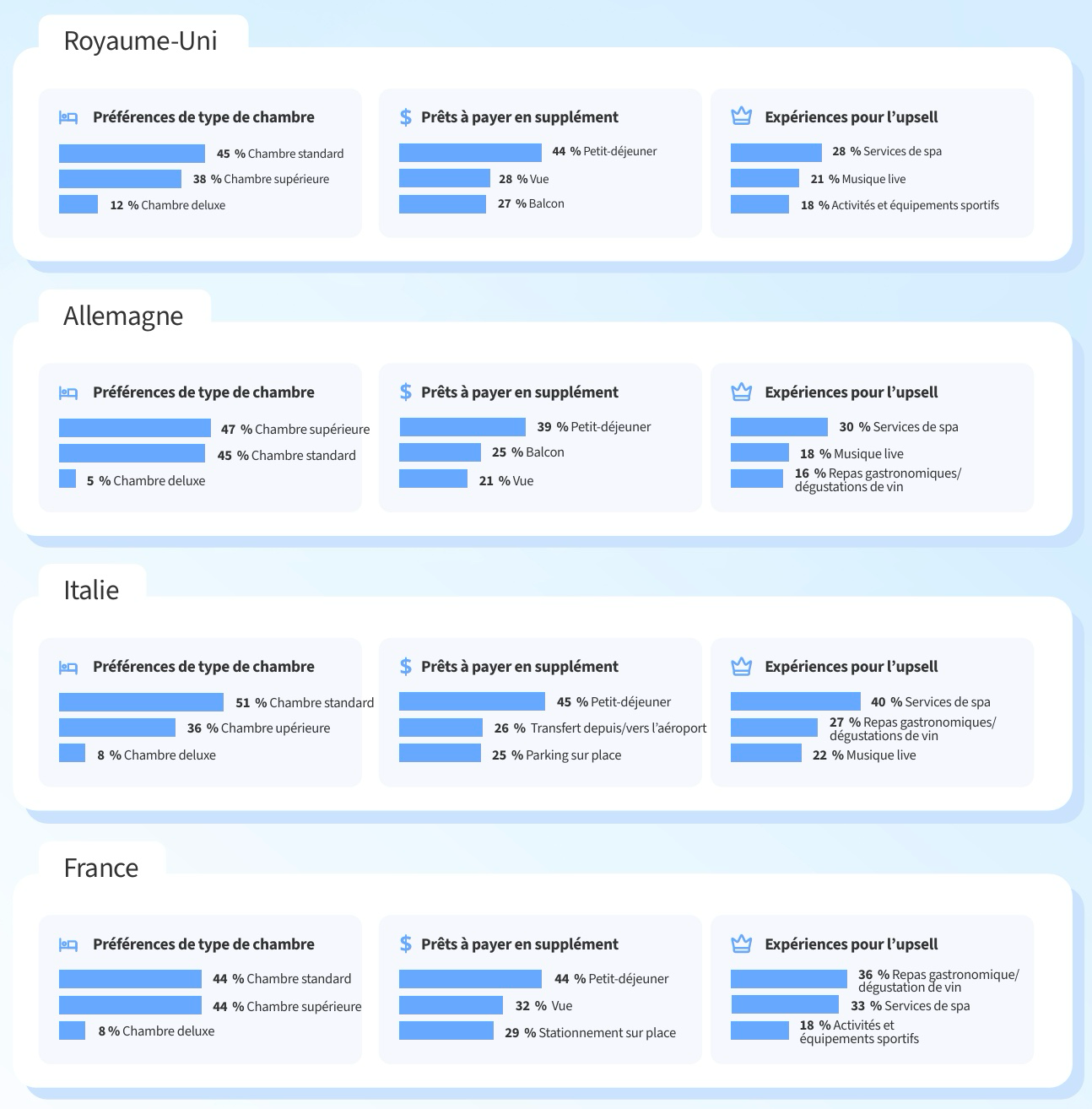 - 58 % comptent choisir une chambre "supérieure" ou "luxe " (+4 points); soit une remontée de la recherche de qualité dans les priorités des voyageurs. Si tel est le cas pour votre établissement, n'omettez donc pas ces termes dans vos présentations tarifaires en ligne,