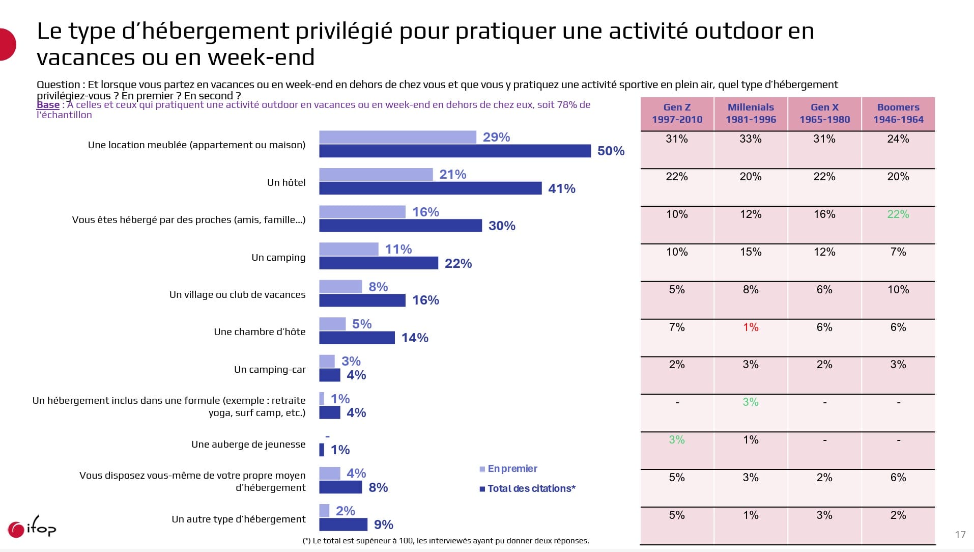 Sur la question du logement, la tendance est claire : 50% des adeptes de l'outdoor privilégient la location meublée (appartement ou maison) tandis que l'hôtel arrive en seconde position (41%). Selon l'étude, la location offrirait cette flexibilité et "cette autonomie tant recherchées par les sportifs qui veulent gérer leur matériel et leur rythme".