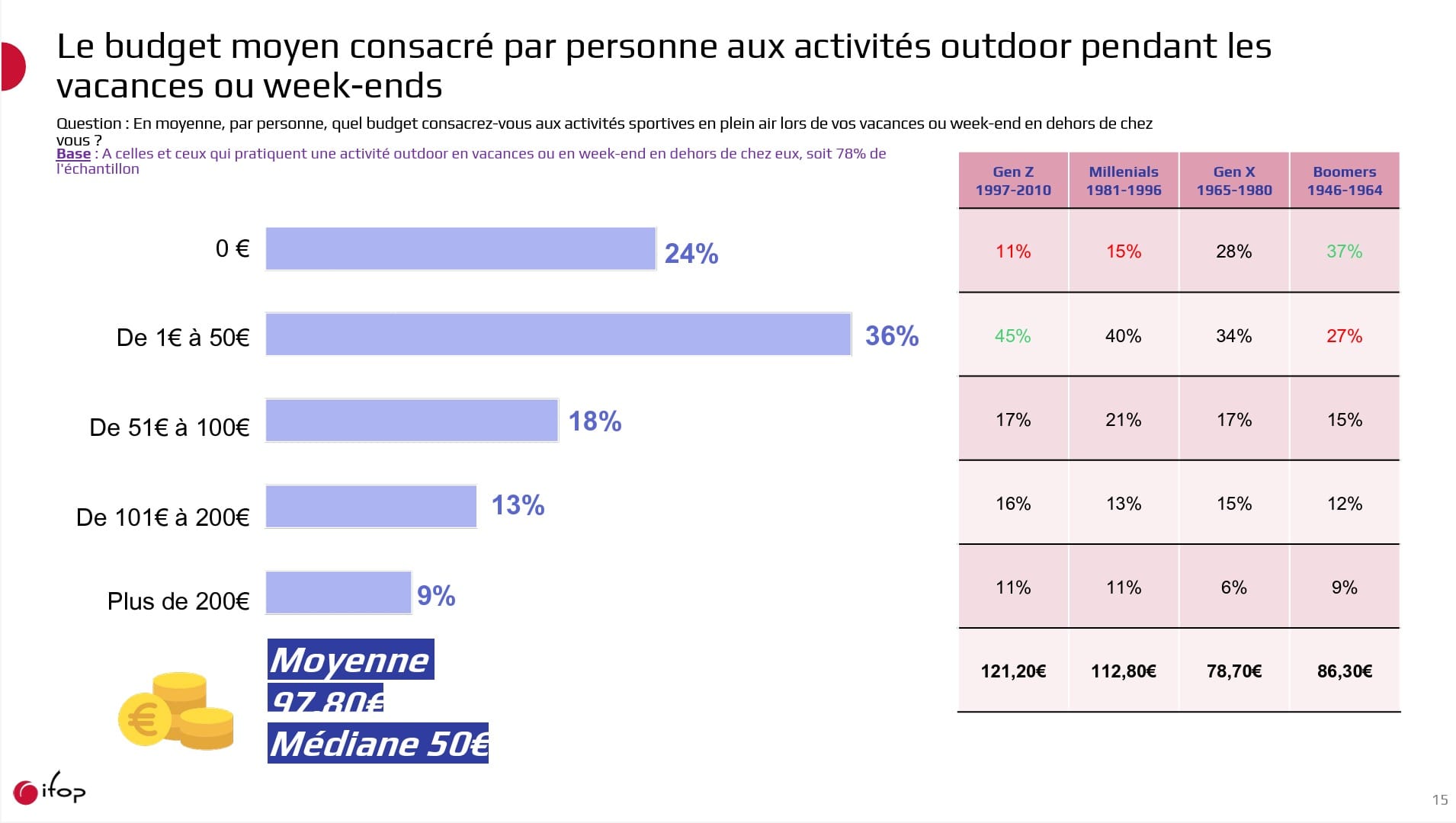 Côté portefeuille, le budget moyen consacré aux activités sportives s'élève à 98 euros par personne pour les vacances. Mais attention, la Gen Z est prête à dépenser davantage (121 euros en moyenne) , attirée par des activités plus onéreuses comme la grimpe ou les sports à sensation.