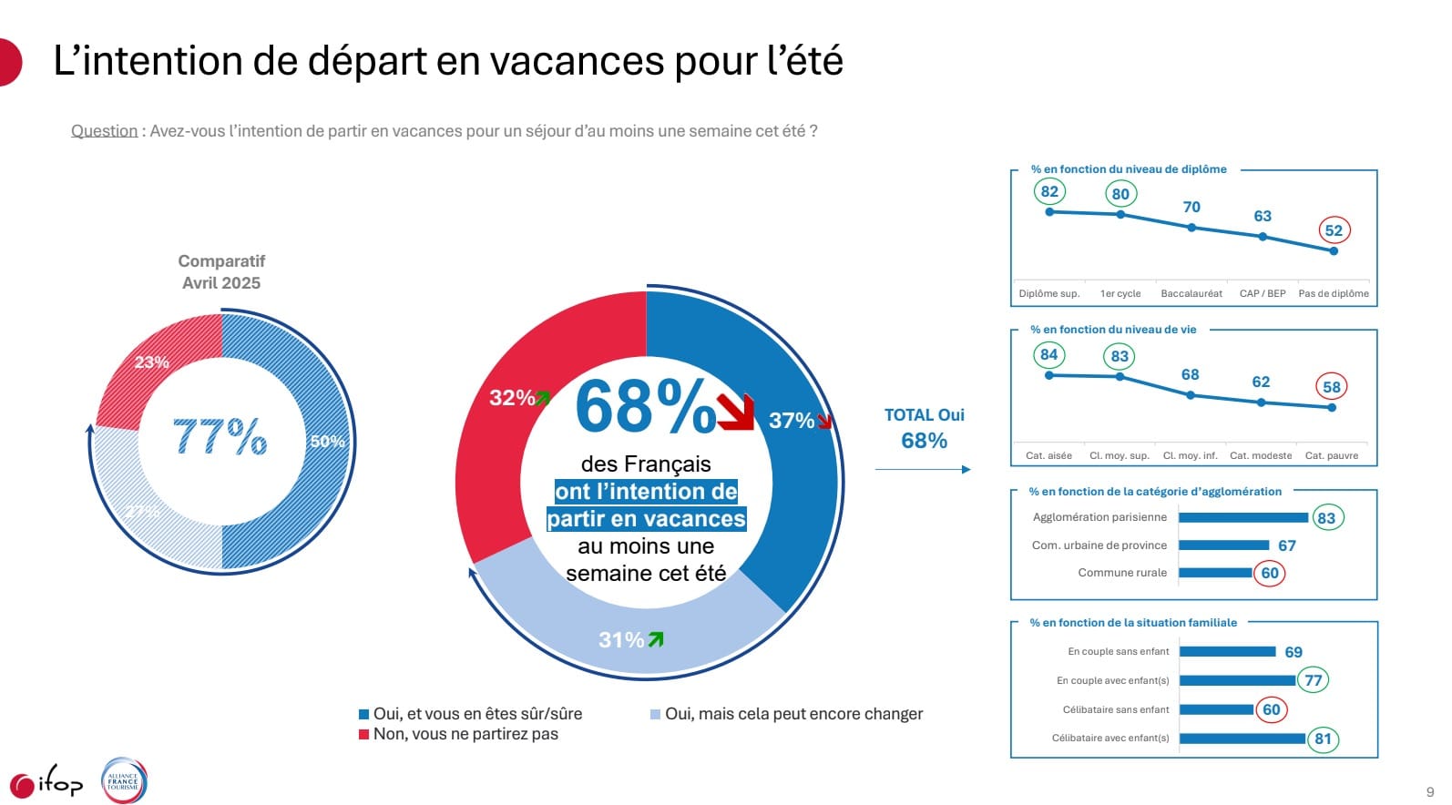 Côté régions, PACA reste la reine, malgré un recul, pour dominer les intentions de départ avec une proportion de 20%; ce qui confirme la dynamique déjà observée en mars (+9,9% de RevPAR). Côté Ouest, l'Occitanie et la Bretagne se partagent la deuxième place (16%) tandis que l'étranger reste en sourdine : l'Italie (10%) et l'Espagne (9%) résistent, tandis que les États-Unis sortent du top 5 au profit du Canada ... plus amical.